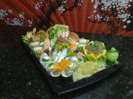 10 sashimis de salmão, 5 sashimis de atum, 5 sashimis de peixe branco, 5 sashimis de kani, 4 sushis de atum, 4 sushis de salmão, 2 sushis de peixe branco, 4 sushis de kani, 2 sushis de camarão, 4 hot filadélfia, 4 teka e 4 califórnia